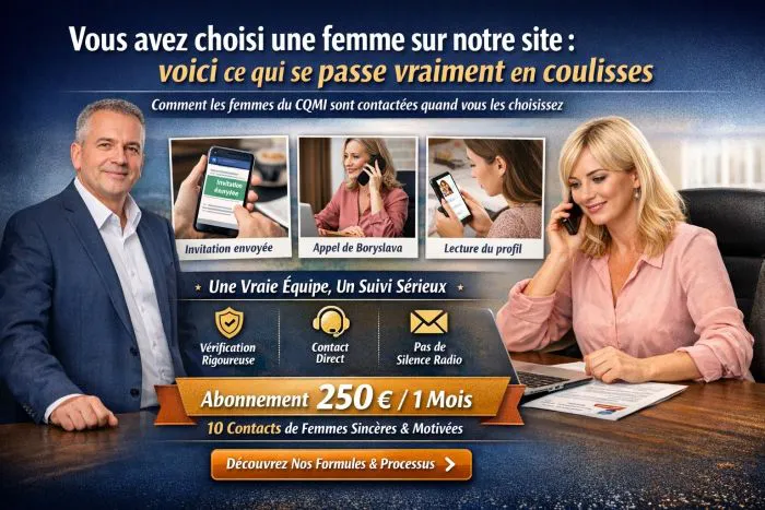 Commençons par le commencement. L'agence CQMI se situe dans la catégorie des agences matrimoniales, et j'insiste sur ce mot. Chez nous, chaque inscription — homme ou femme — est validée manuellement par un être humain. Personne, je dis bien personne, ne peut apparaître sur notre site sans une vérification rigoureuse de notre part.